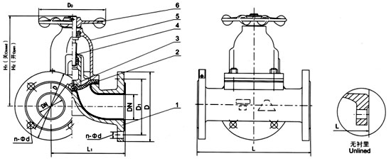 部件列表:1、閥體 2、隔膜 3、閥瓣 4、閥桿 5、閥蓋 6、手輪 二、三通隔膜閥用途: 三通隔膜閥用途:三通隔膜閥專用于控制非腐蝕性或一般腐蝕性介質,閥體內腔表面無襯里或覆有可供選擇的各種橡膠,適用于不同工作溫度和流體管路。 三、三通隔膜閥材料: 閥體:鑄鐵、球墨鑄鐵、碳鋼、不銹鋼 四、三通隔膜閥測試: 襯里層:電火花檢測 五、三通隔膜閥結構特點: 隔膜閥是一種特殊形式的截止閥; 六、G49J三通隔膜閥主要尺寸及重量: