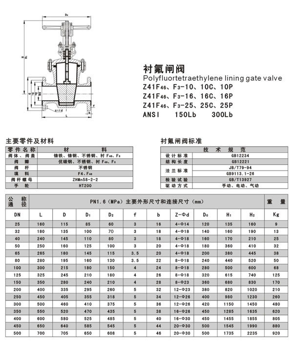 閘閥是一種帶見的啟閉閥門,利用兩側(cè)面密封呈楔狀的閘板來接通或截?cái)喙苈分薪橘|(zhì),楔式閘閥不允許微量開啟在管路中作節(jié)流裝置用,以免因高速流動(dòng)的介質(zhì)沖蝕而加快密封面的損壞。FEP(F46)、PCTFE(F3)襯氟閘閥適用在-20℃~150℃的各種濃度的王水、硫酸、鹽酸、氫氟酸和各種有機(jī)酸、強(qiáng)酸、強(qiáng)氧化劑,FEP還適用于各種濃度的強(qiáng)堿有機(jī)溶劑以及其它腐蝕性氣體、液體介質(zhì)的管路上使用。