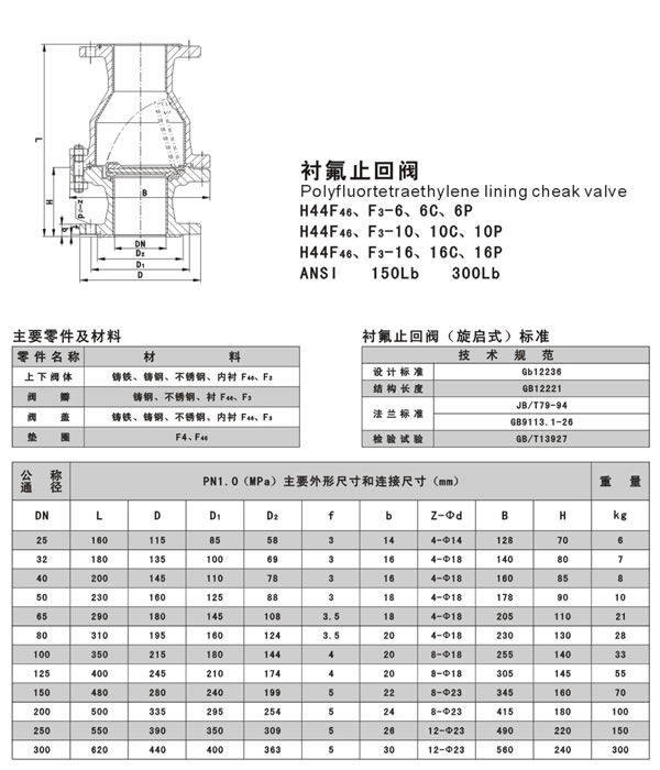 襯氟止回閥(又稱逆止閥、單向閥)這種類型的止回閥的作用是只允許介質(zhì)向一個方向流動,阻止介質(zhì)逆流。這種止回閥是自動工作的,介質(zhì)流動的流體壓力作用下,閥瓣打開;介質(zhì)反方向流動時,由流體壓力和閥瓣的自重合閥瓣作用于閥座,從而切斷介質(zhì),防止逆流。襯氟止回閥內(nèi)襯聚四氟乙烯,將介質(zhì)與閥體完全隔離開,避免腐蝕性的介質(zhì)對閥體侵蝕。襯氟止回閥適用場合各種濃度的王水、硫酸、鹽酸、氫氟酸和各種有機(jī)酸、強(qiáng)酸、強(qiáng)氧化劑等。
