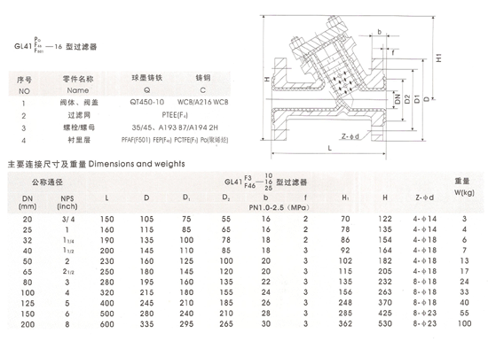 三、GL41F型襯氟過(guò)濾器型號(hào)規(guī)格 公稱(chēng)壓力:1.0~2.5MPa 公稱(chēng)通徑:20~450mm。