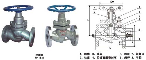柱塞閥是由閥體、閥蓋、閥桿、柱塞、孔架、密環(huán)、手輪等零件組成(如圖)。當(dāng)手輪旋轉(zhuǎn)時,通過閥桿帶動柱塞在孔架中間上下往復(fù)運動來完成閥門的開啟與關(guān)閉功能。在閥門中柱塞與密封環(huán)間采用過盈配合,通過調(diào)節(jié)壓蓋中法蘭螺栓,使密封環(huán)壓縮所產(chǎn)品生的側(cè)向力與閥體中孔面及柱塞外圓密封,從而保證了閥門的密封性,杜絕了內(nèi)泄漏、同時閥門開啟矩小、能實現(xiàn)閥門的迅速開啟和關(guān)閉。柱塞閥由于密封環(huán)采用回彈性強、耐磨性高的無毒新型密封材料,具有經(jīng)受長期高溫、高壓而不喪失彈性,所以密封性能可靠,經(jīng)久耐用。