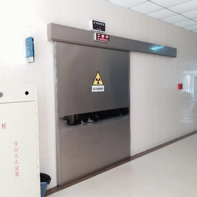 8 醫院防輻射鉛門,門體加貼防輻射標志并在防護門上方加裝指示燈提醒人員注意射線防護!電動推拉防護門可加裝門機聯鎖裝置,防護門關閉不嚴時*機械無法啟動以確保人員安全。